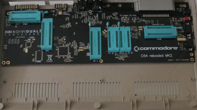The Commodore 64 Reloaded MK2 is a C64 Motherboard for building a C64 on your own. This board is shipped with empty ZIF sockets for chips such as CPU, port chips, SID and VIC chips. All other components as PLA, RAM, clock generator is already on board.